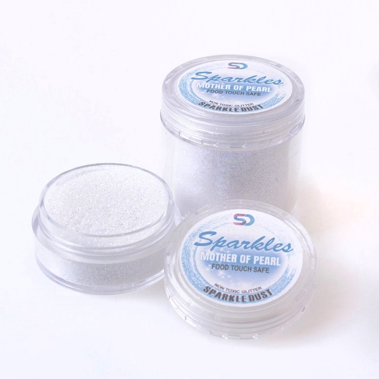 MOTHER OF PEARL is white-based, like our white Sparkle Dust, but with a difference. The colour of the glitter is not only orange and green, but a beautiful purple is added to the mix. A wonderful Sparkle that will complement any other colour. Food touch safe.